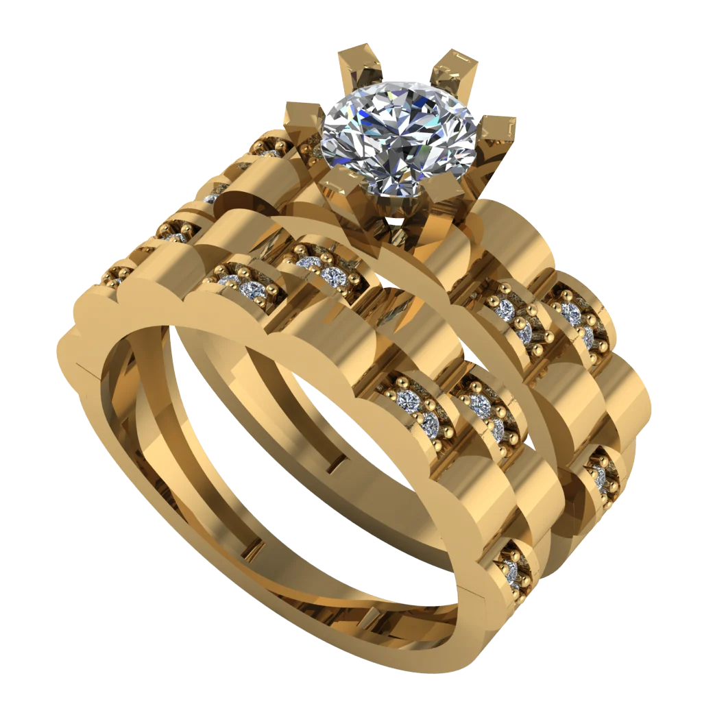 Центральный камень поднят над тройной шиной, где ленты расходятся параллельными линиями и частично инкрустированы: сияние ровное, а тёплым золотом подчеркнуты гладкие кромки и чистый профиль.