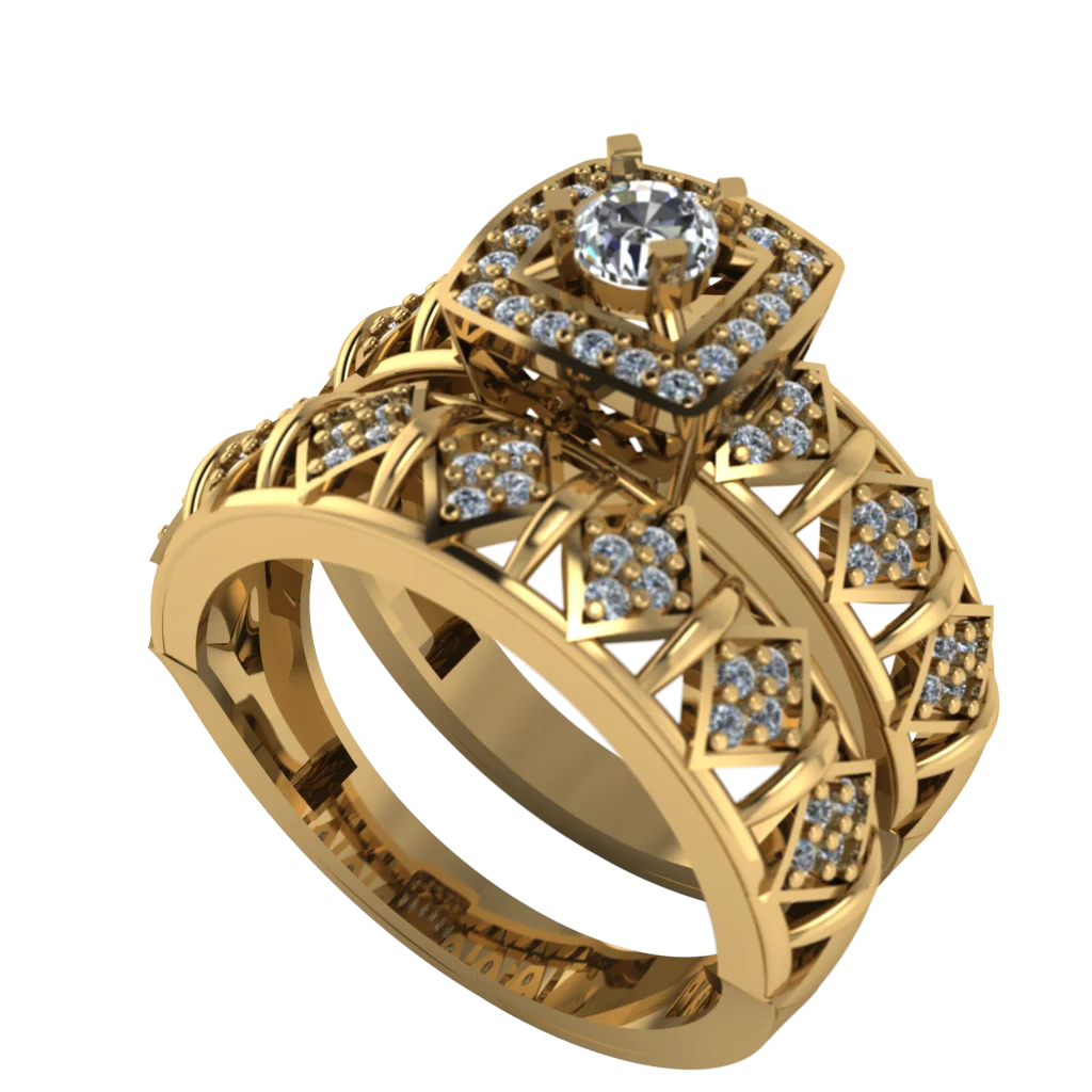 Центральный камень в короне сочетается с широкой шиной, украшенной резными панелями и мелкой инкрустацией: рисунок строгий и архитектурный, а в золоте полировка подчёркивает глубину и торжественное сияние.