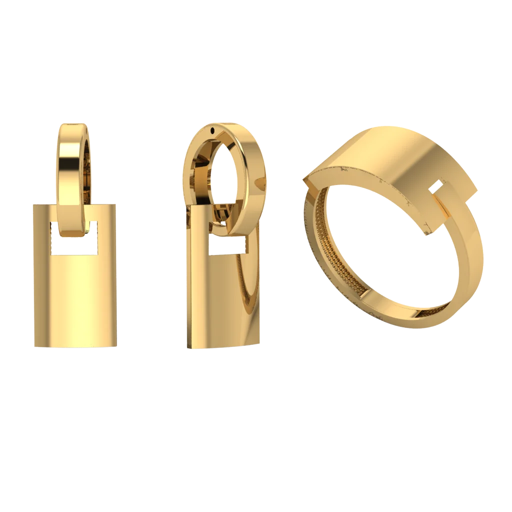Комплект с серьгами-скобами и кольцом с прямоугольным проёмом: гладкий металл, строгая геометрия, без камней. Минимализм, который особенно чисто смотрится в золоте.