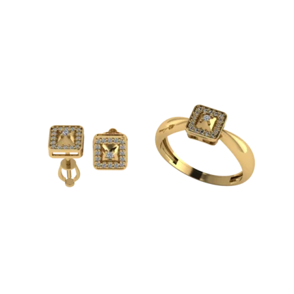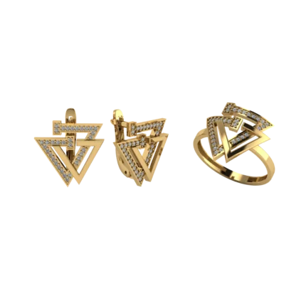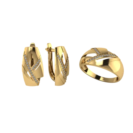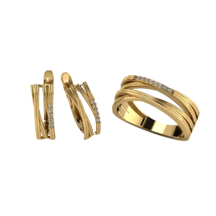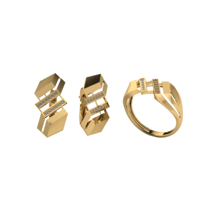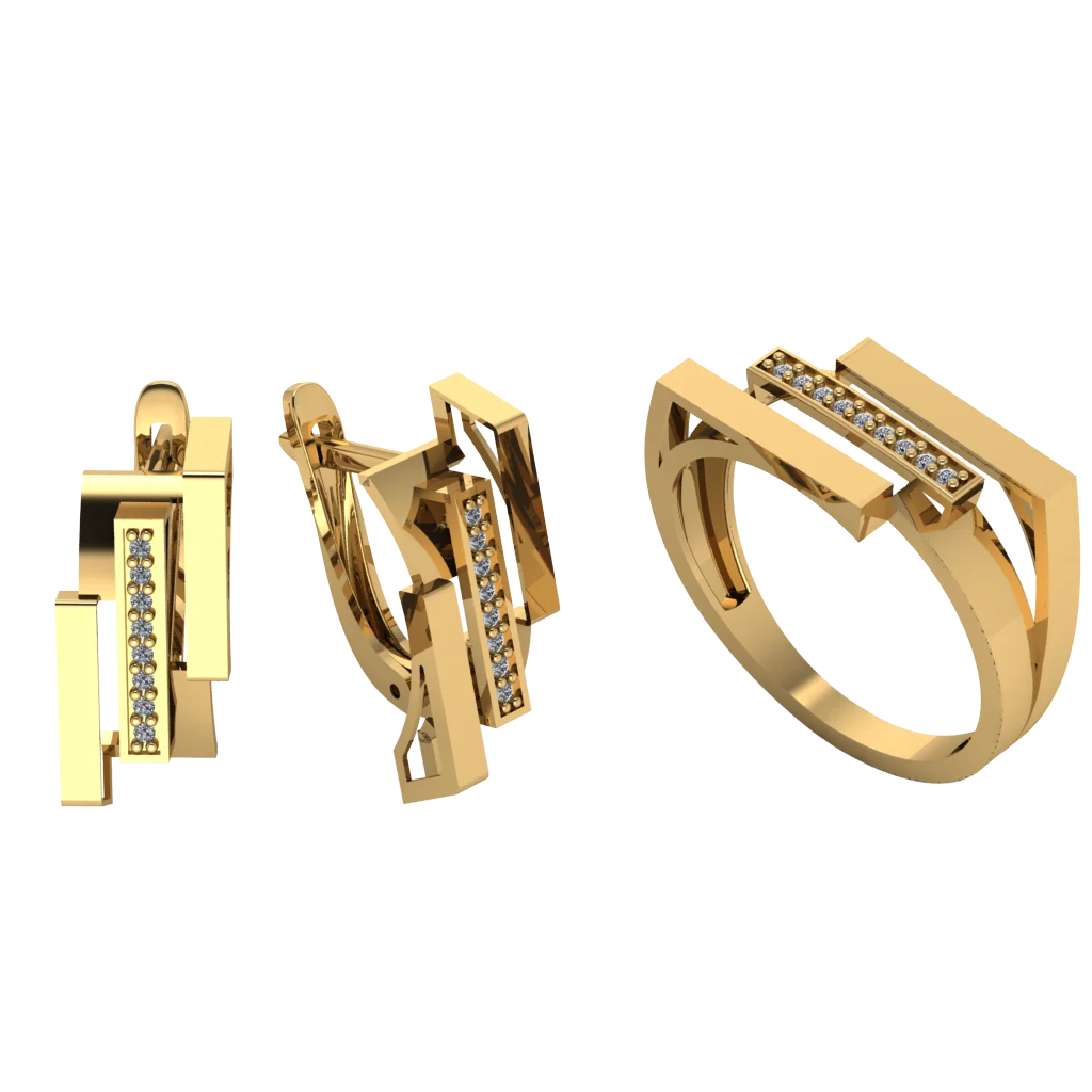 Геометричный дуэт: серьги-хагги и кольцо с прямоугольными плоскостями и вертикальной дорожкой камней. Чёткие грани, аккуратное сияние и современный характер, особенно в золоте.