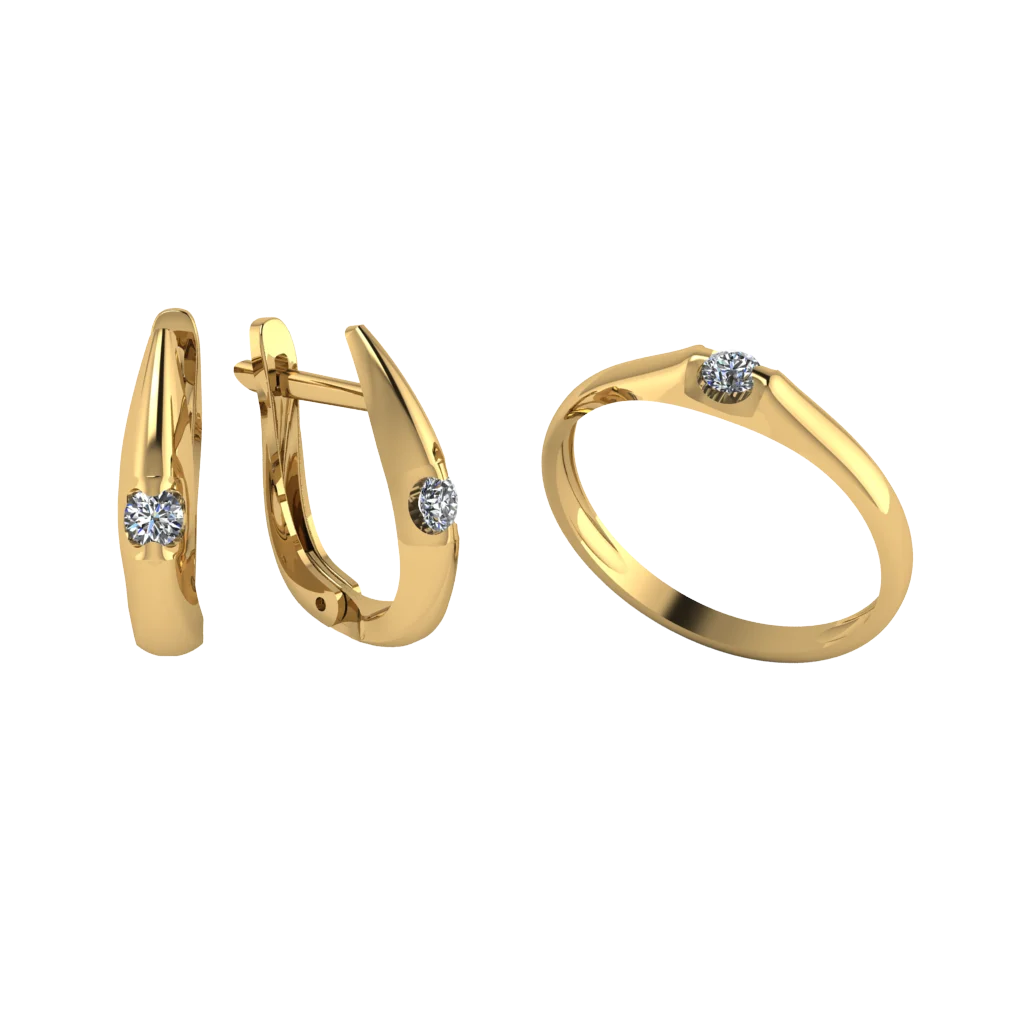 Лаконичная пара украшений: серьги-хагги и кольцо с одиночным круглым камнем в аккуратной посадке. Сдержанный блеск без перегруза, легко сочетается с любыми базовыми образами.