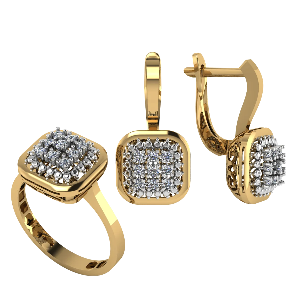 Флористический мотив из прозрачных «лепестков» и центрального камня, дополненный сияющей рамкой. Кольцо и серьги смотрятся нарядно, а золото делает блеск мягче и теплее.