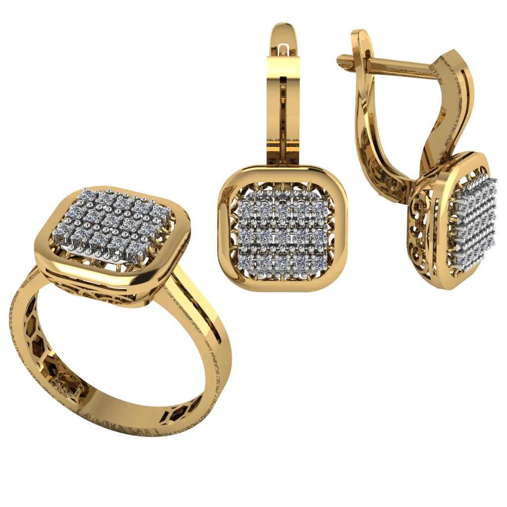 Комплект с мягким квадратом: верх серьги и кольца полностью усыпан мелкими камнями, создавая плотное, ровное сияние. Гладкая рамка подчёркивает форму, золото выглядит чисто и опрятно.