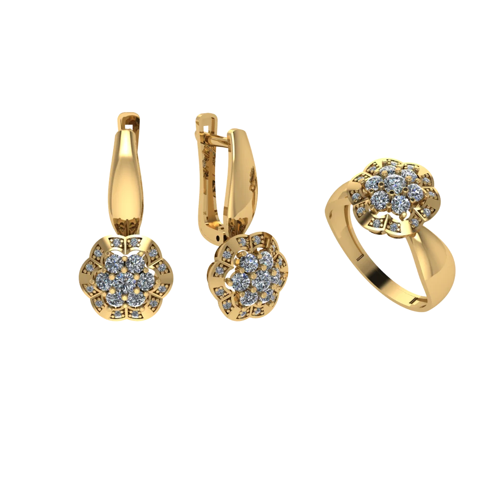 Сет серьги плюс кольцо с круглой розеткой и камнями, декоративные элементы по контуру создают объём, блеск получается ярким, но без ощущения спама в описании.