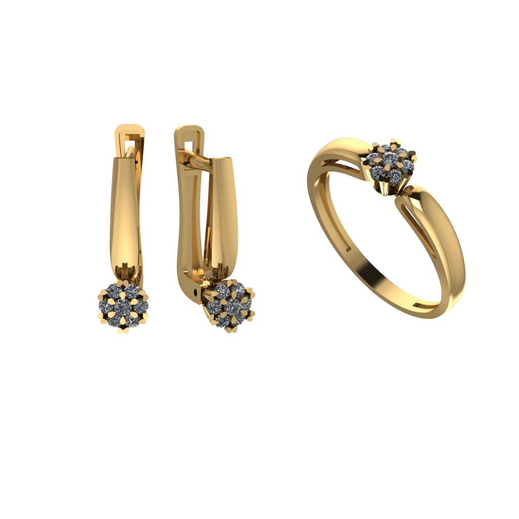 Сдержанный дуэт: серьги и кольцо с небольшой верхушкой и прозрачными камнями, минимум лишних деталей, чистое сияние и ровные линии металла хорошо сочетаются с базовой одеждой.