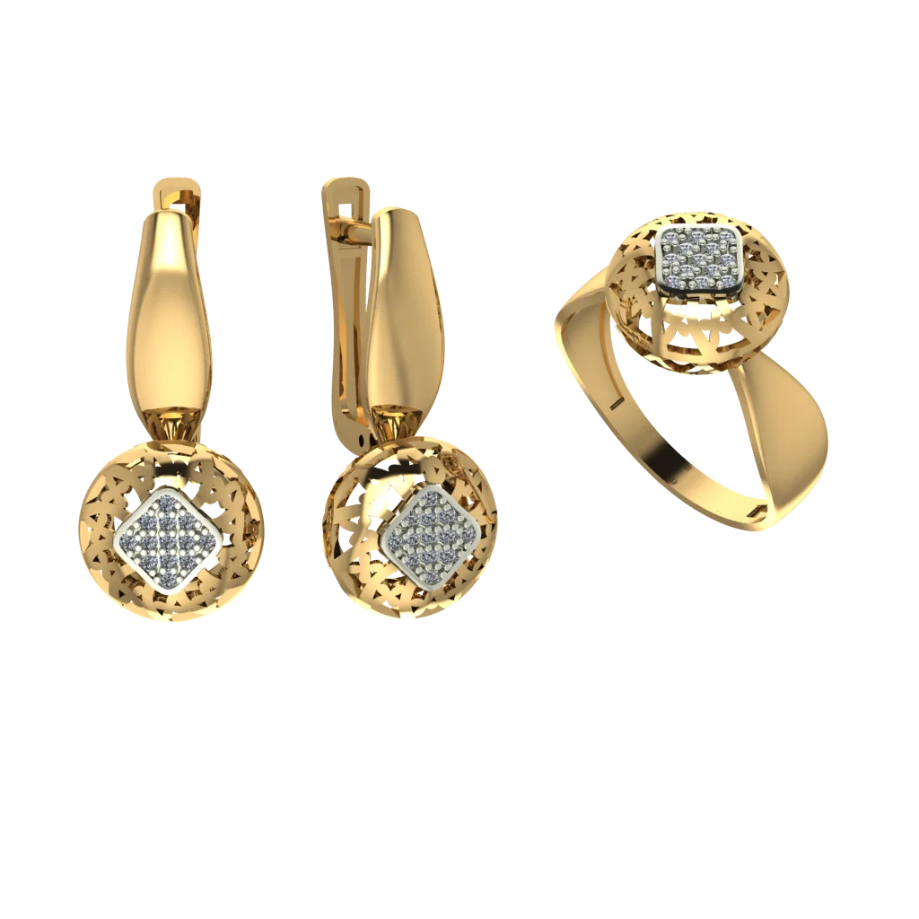 Сет с круглыми верхушками и камнями, орнамент на площадке добавляет фактуру, серьги и кольцо смотрятся нарядно, а золото смягчает общий блеск.