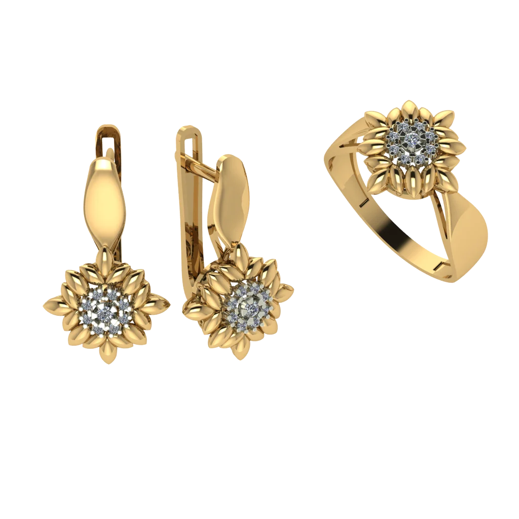 Сет с круглой розеткой и аккуратным ореолом камней, серьги поддерживают тот же мотив, верхушка смотрится объёмно, но не утяжеляет образ.
