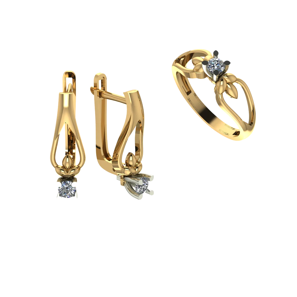 Серьги и кольцо с выраженным рельефом и сияющими камнями, верхушка выглядит объёмнее за счёт фактуры, золото подчёркивает детали и делает акцент благородным.