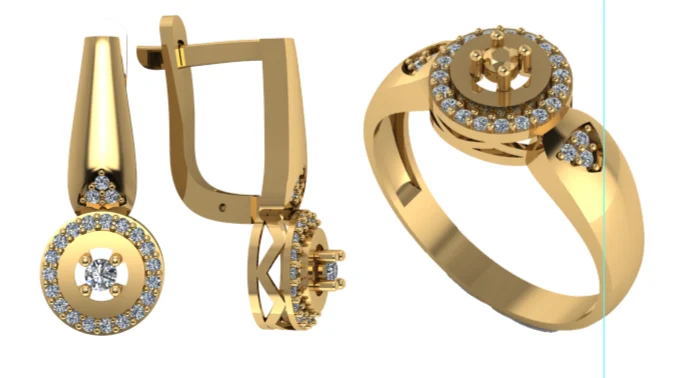 Сет с круглыми акцентами: серьги с мерцающим кругом и кольцо с круглой верхушкой, где камни собраны плотной россыпью. Дизайн универсальный и хорошо смотрится в золоте.