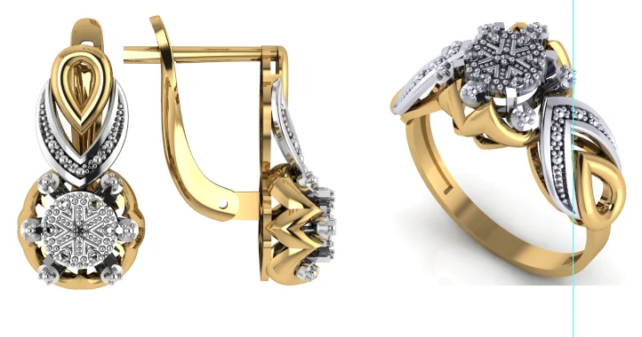 Сет с кольцом и серьгами в виде круглого медальона, внутри звёздный узор и вставки прозрачных камней, скрученные линии оправы добавляют динамику золоту.