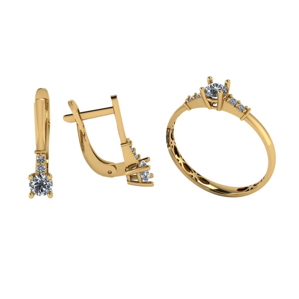 Элегантный дуэт: серьги на английском замке и кольцо с солитером, по бокам есть аккуратные камни-акценты. Блеск чистый и ровный, золото подчёркивает огранку и не перегружает композицию.