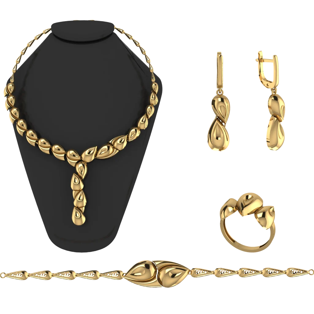 Современный сет с овальными звеньями и плавными каплями: колье, браслет, серьги и кольцо держат один ритм форм. Без камней, ставка на геометрию и мягкий блеск золота.
