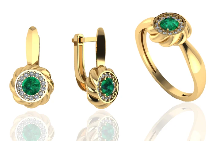Комплект с серьгами и кольцом, где крупная вставка дополнена мелкими камнями на линии оправы. Сияние ровное, форма читается сразу, тёплое золото делает цвет камня более глубоким.