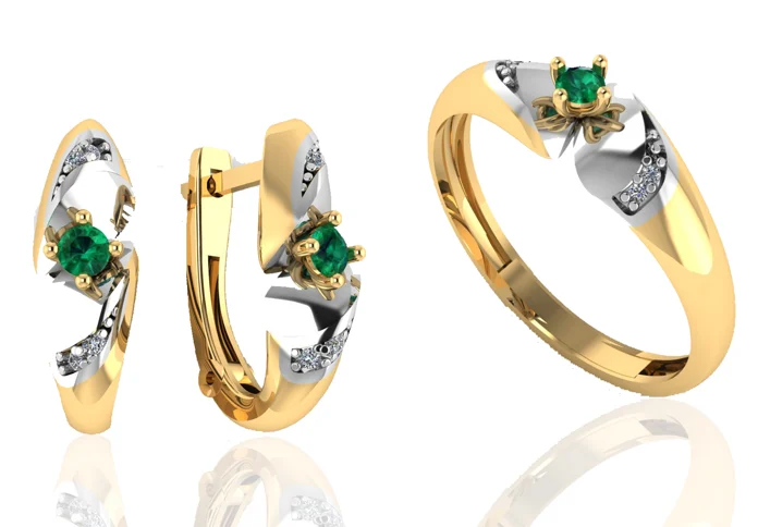 Гарнитур в строгой посадке: серьги и кольцо с центральной вставкой и аккуратным паве на отдельных участках. Сияние деликатное, без лишних деталей, золото добавляет мягкий «дорогой» оттенок.