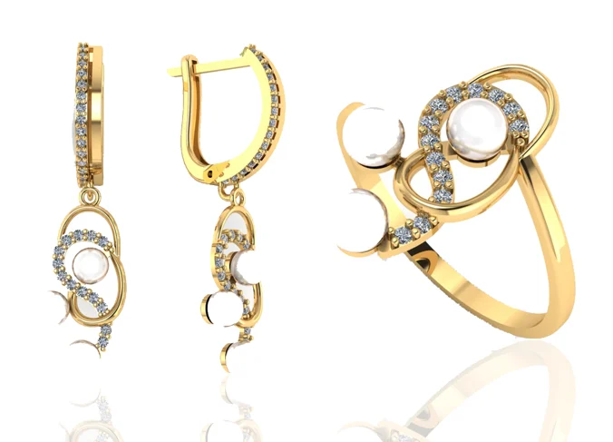 Гарнитур с серьгами и кольцом, где камни собраны в более крупную композицию и поддержаны мелкими вставками по линии оправы. Сияние заметное, но аккуратное, в золоте комплект смотрится цельно и нарядно.