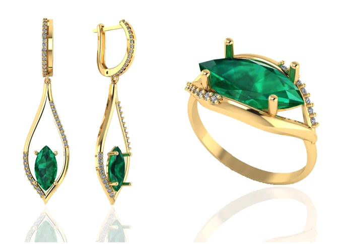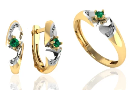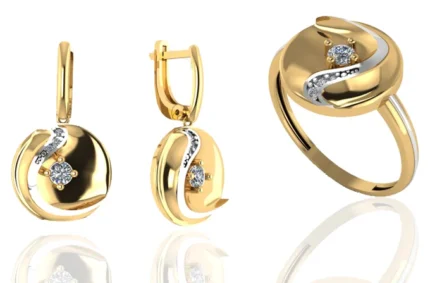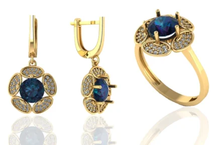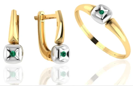 Комплект с камнем в центре и «ореолом» из прозрачных камней: серьги и кольцо сохраняют строгую посадку. В золоте выглядит статусно и хорошо читается на свету.
