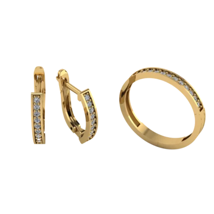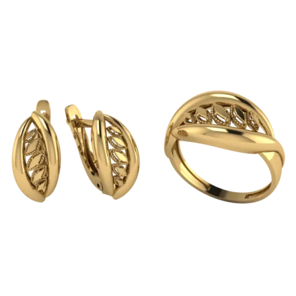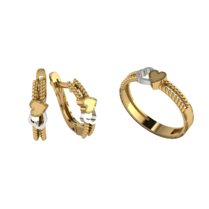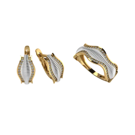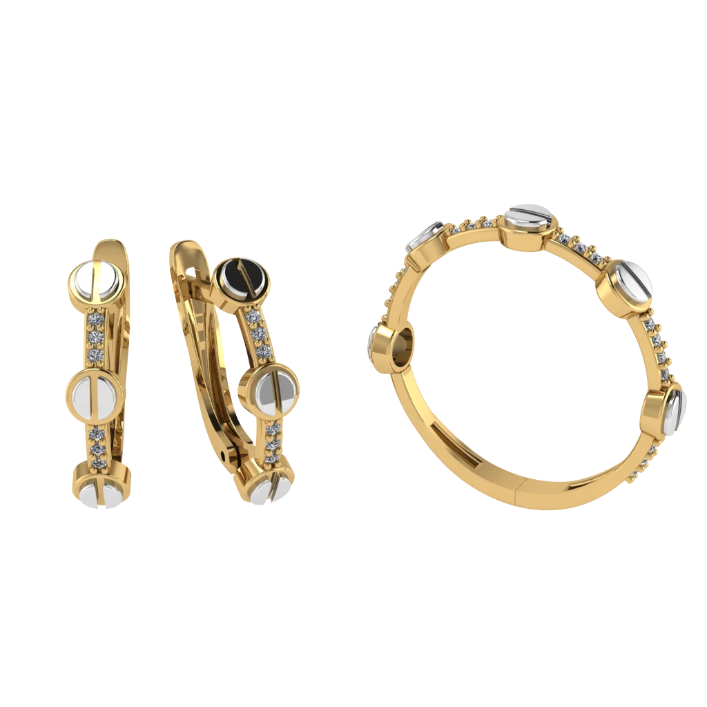 Комплект с кольцом и серьгами, декорированными круглыми деталями под винтовые шляпки и контрастными вставками, дополнен линией камней. Эффектный дизайн в золоте.