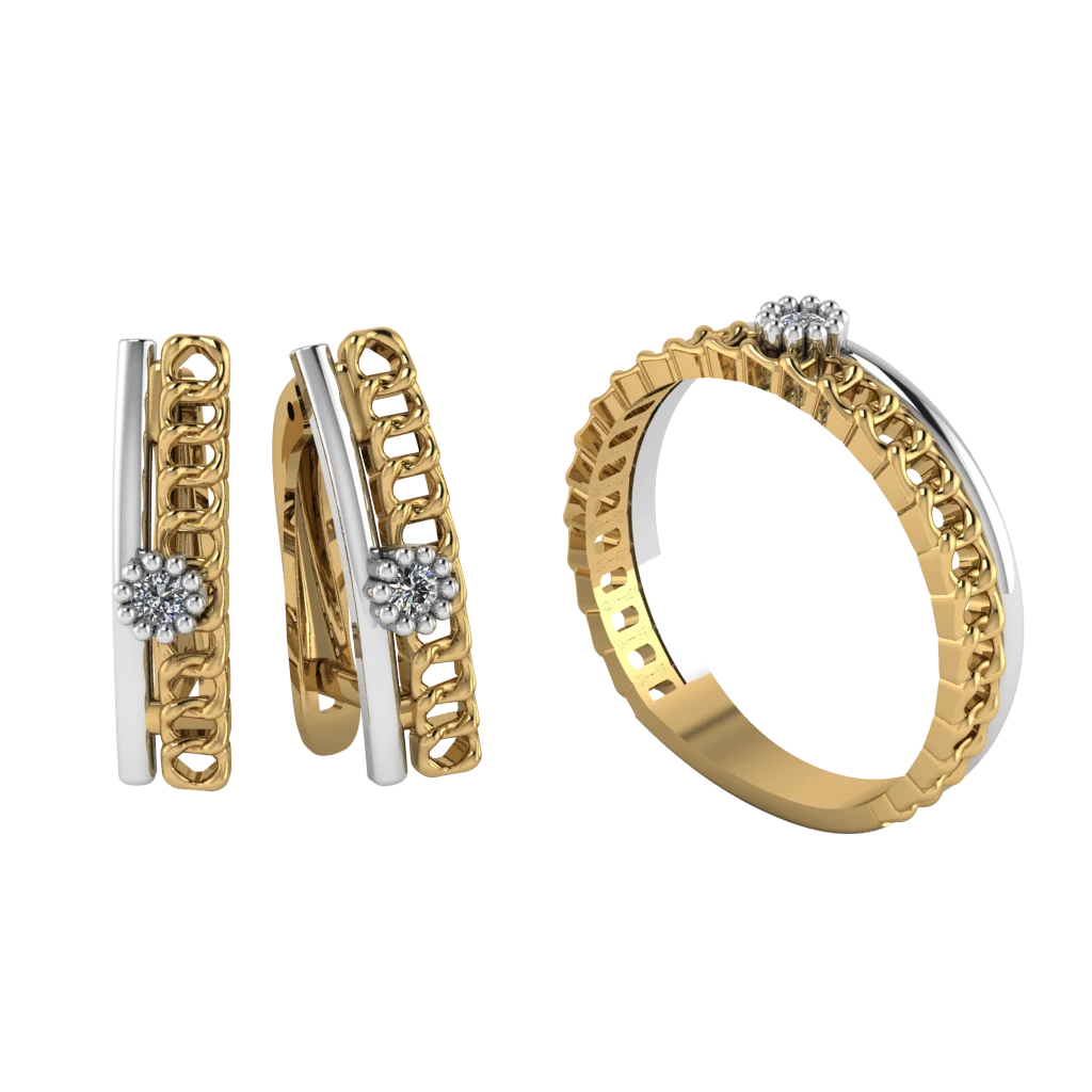 Комплект с кольцом и серьгами, где центральный цветок собран из прозрачных камней, дополнен цепочными элементами и гладкой вертикальной вставкой. Яркий акцент в золоте.