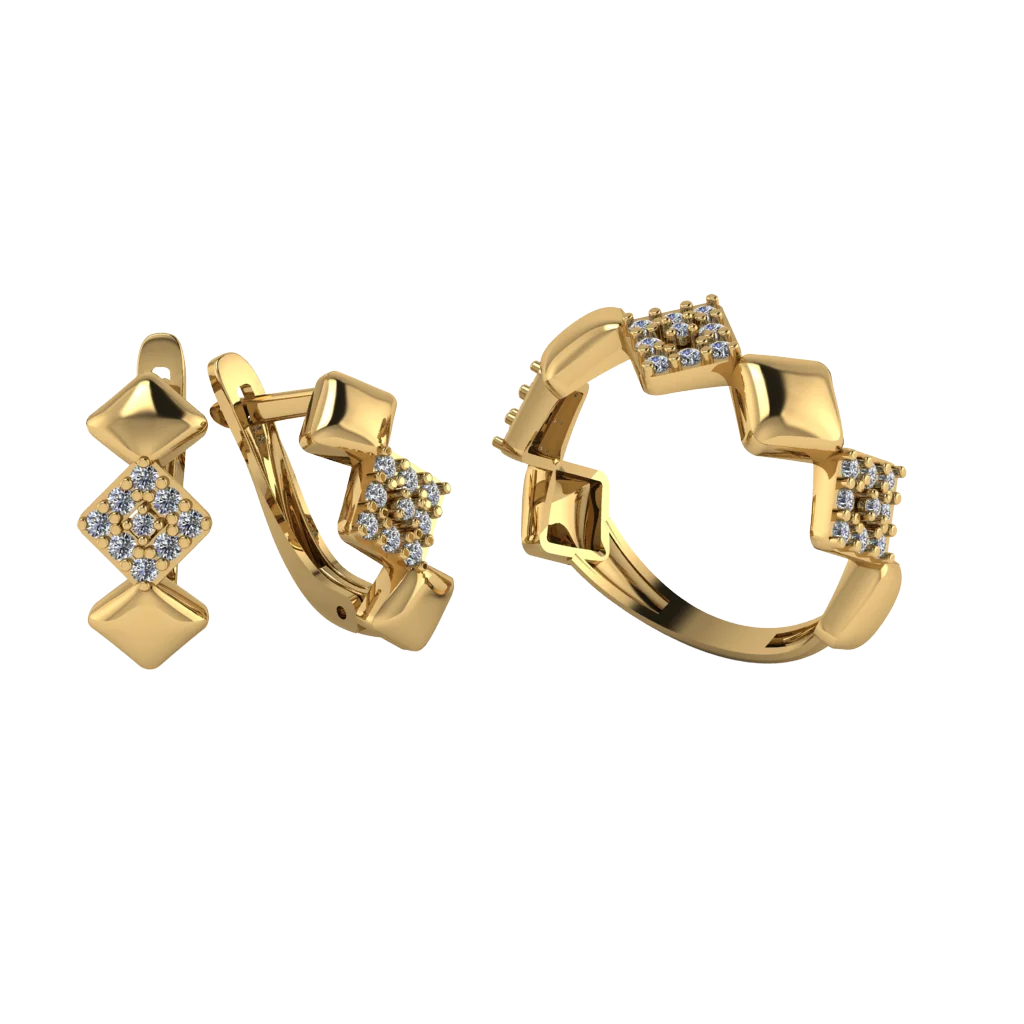 Сет из кольца и серёг с круглыми элементами и тонкой линией камней, встроенной в гладкую поверхность. Золото создаёт тёплый фон, а блеск камней даёт аккуратный «огонёк».