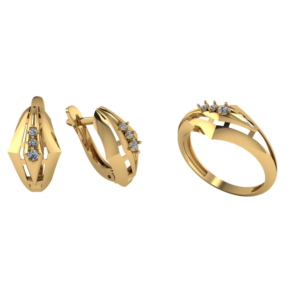 Комплект с кольцом и серьгами в вытянутой геометрии: открытая рамка и три камня в вертикальном ряду создают строгий ритм. Золото добавляет тепла, а вставки дают аккуратное сияние.