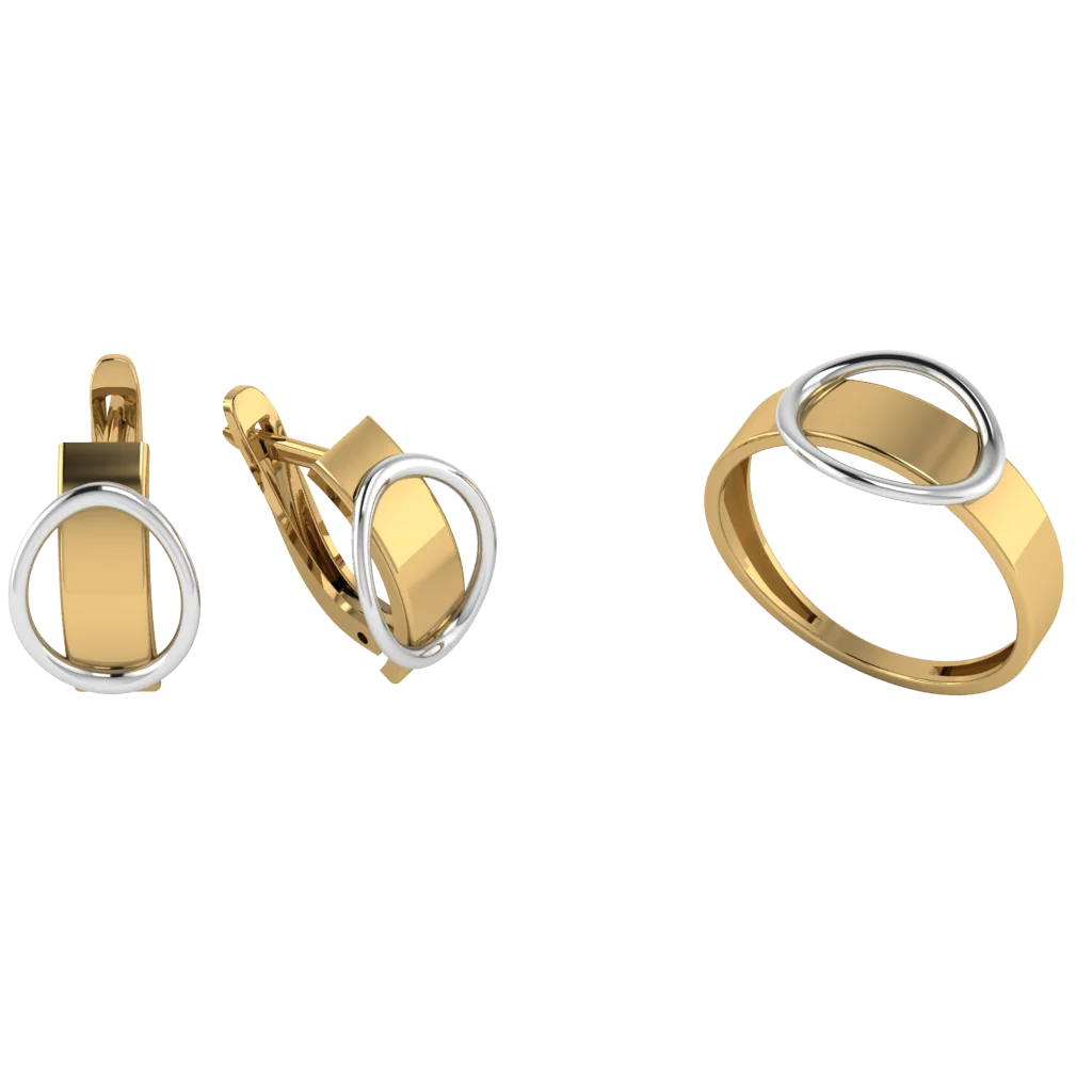 Сет из кольца и серёг с круглой рамкой и контрастным внутренним ободком: дизайн простой, но эффектный за счёт двух оттенков металла. Золото подчёркивает округлость и аккуратный блеск.