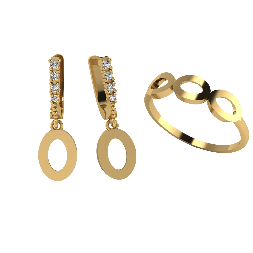 Сет с вытянутыми овальными элементами и светлой вставкой: серьги дополнены небольшой линией камней, кольцо — переплетением гладких дуг с мерцанием. Золото делает образ тёплым и современным.