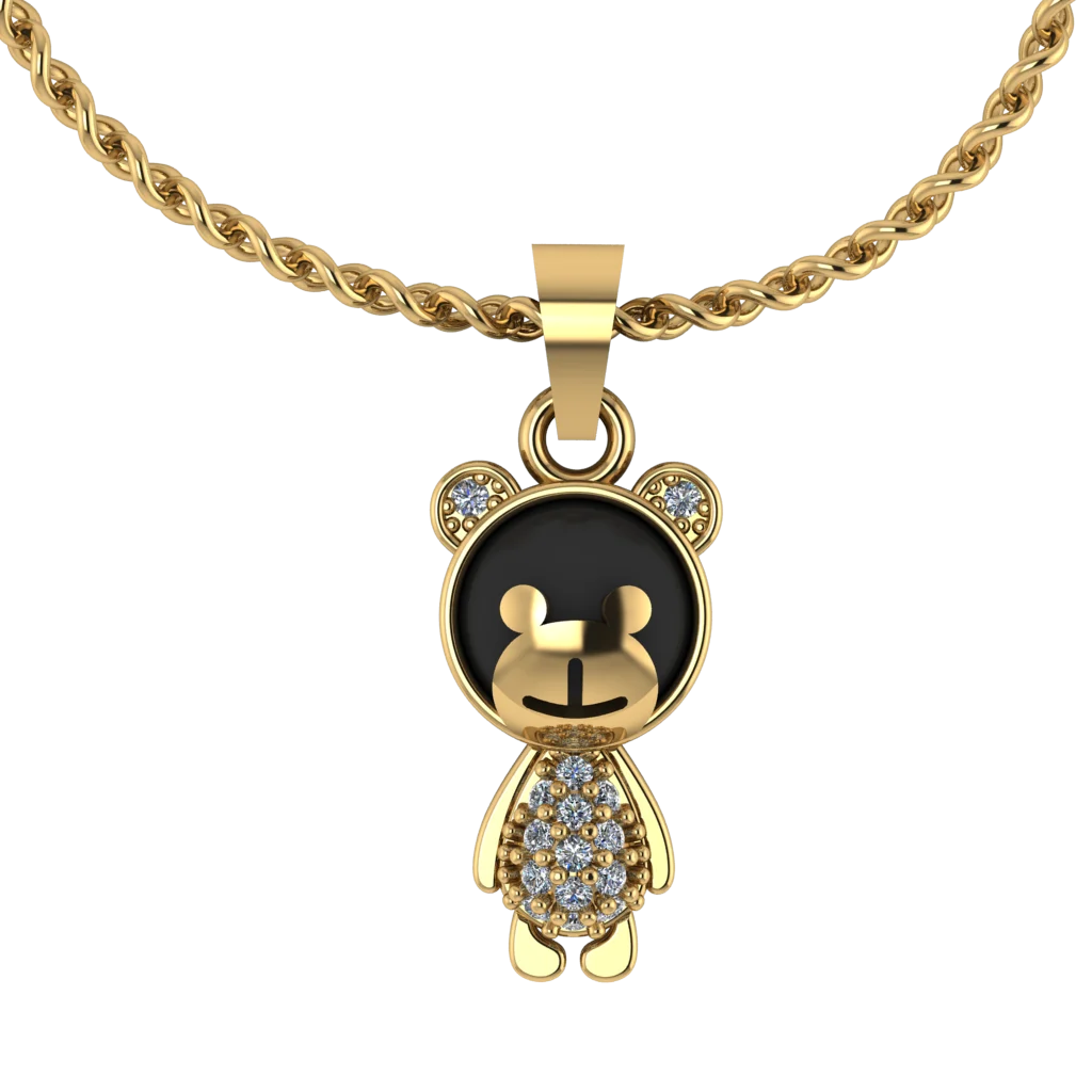 Круглая подвеска с мордочкой мишки и сияющей дорожкой камней внизу: гладкое золото и милый мотив, который смотрится аккуратно и современно на цепочке каждый день.