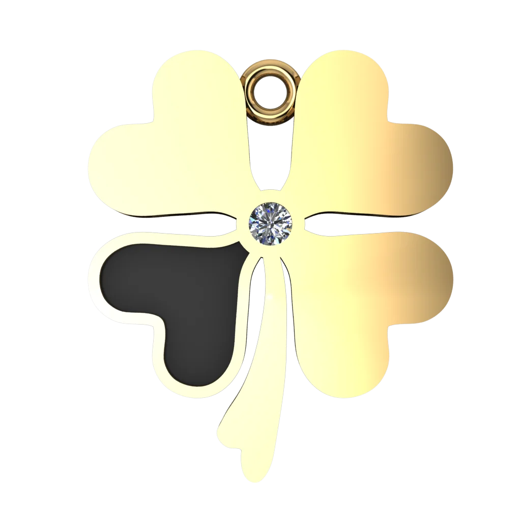Сдержанный четырёхлистник с одним тёмным лепестком и центральным сияющим камнем, остальная часть гладкая. Тёплое золото смягчает контраст и делает украшение универсальным для повседневного стиля.