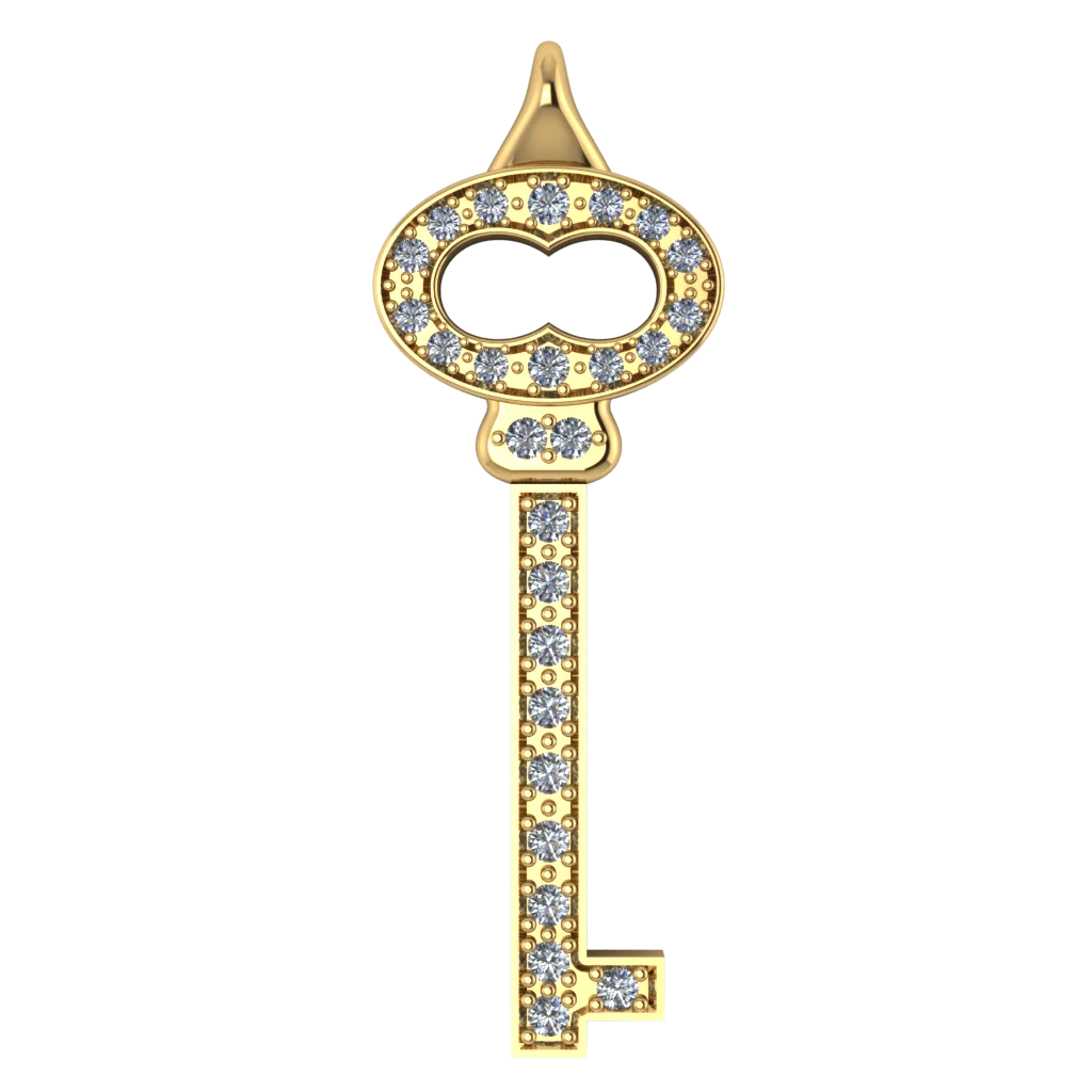 Ключ с вытянутой головкой каплей: внутри тёмная вставка, по обрамлению и на ножке идёт дорожка из прозрачных камней. За счёт контраста украшение выглядит аккуратно, но очень заметно.