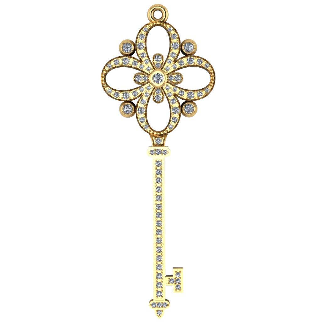 Ключ с четырёхлепестковой головкой, собранной из прозрачных камней. Ножка украшена камнями по всей длине, а тёмный фон подчёркивает рисунок, поэтому изделие в золоте смотрится особенно нарядно.