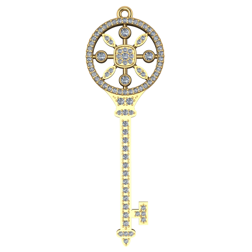 Ключ с круглой головкой и цветком из камней в центре. Тёмная вставка усиливает блеск, по краю и на ножке заметна инкрустация камнями, поэтому подвеска выглядит богато, но не перегружено.