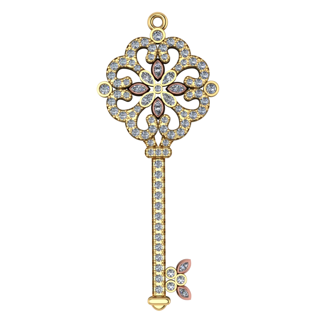 Пышный ключ с ажурной головкой и множеством камней, собранных в цветочный орнамент. На ножке продолжается дорожка из камней, а тёмные акценты делают рисунок объёмным и очень нарядным.