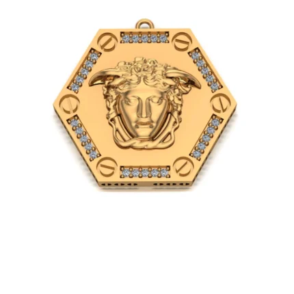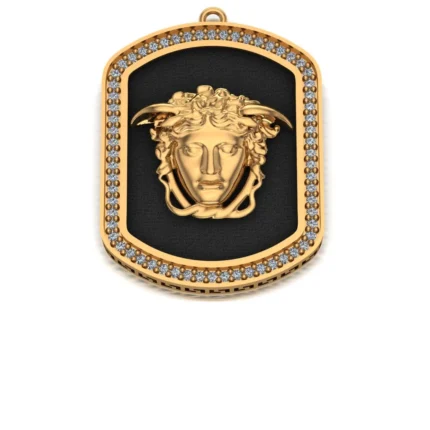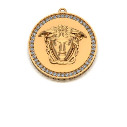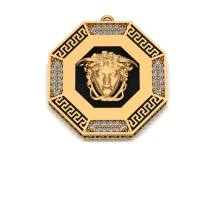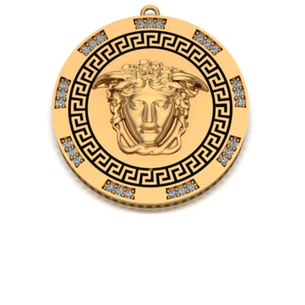 Круглый кулон с богатой отделкой: внешний пояс с меандром в чёрной вставке, внутренняя площадка густо усыпана камнями, а в центре рельеф. Сияние яркое, но без перегруза.