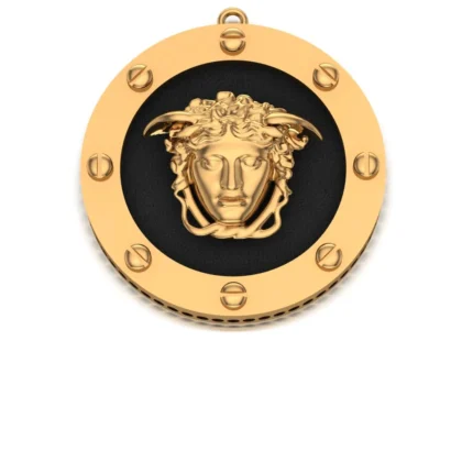 Подвеска с чёткой геометрией: чёрный круговой меандр по краю и рельефная Медуза на фоне мелкой клетчатой фактуры. В золоте получается строгий городской акцент.
