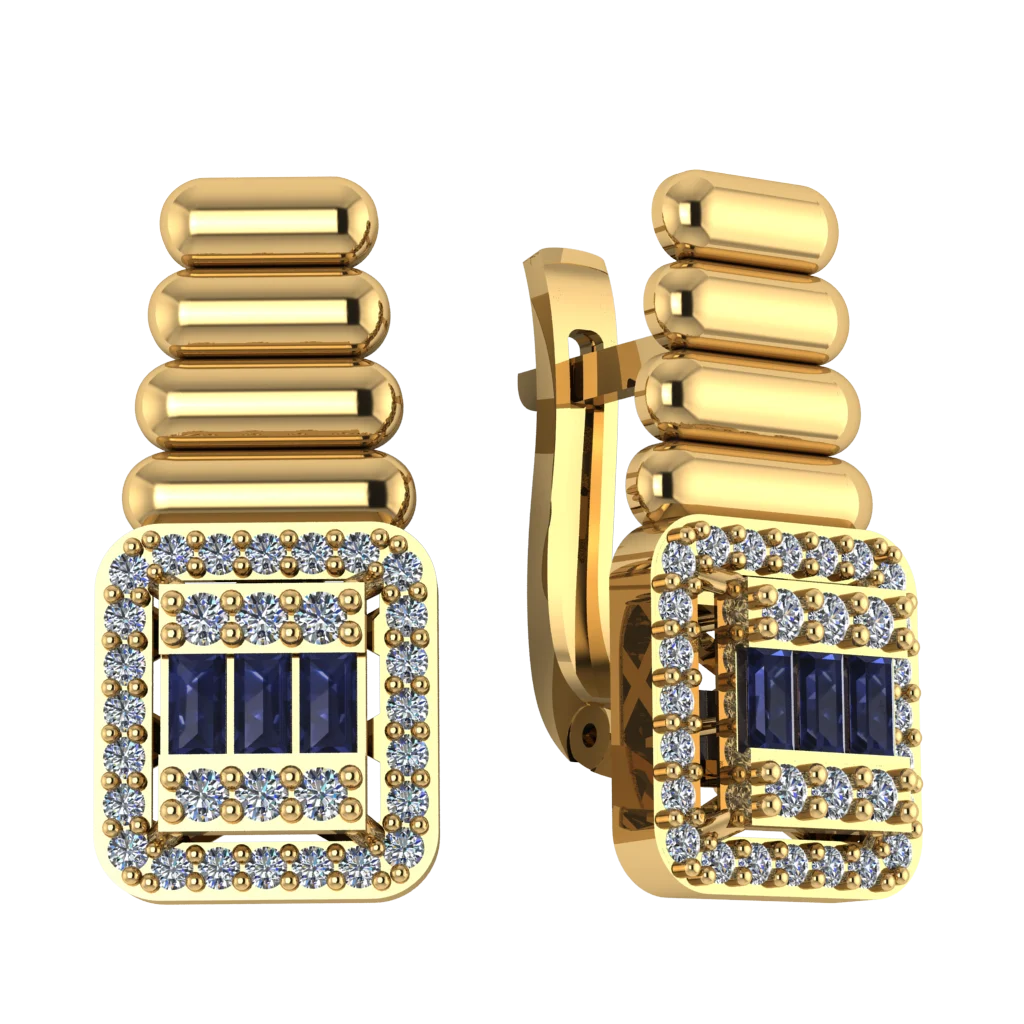 Серьги с крупной прямоугольной панелью и синими камнями. Яркий акцент и выразительная геометрия.