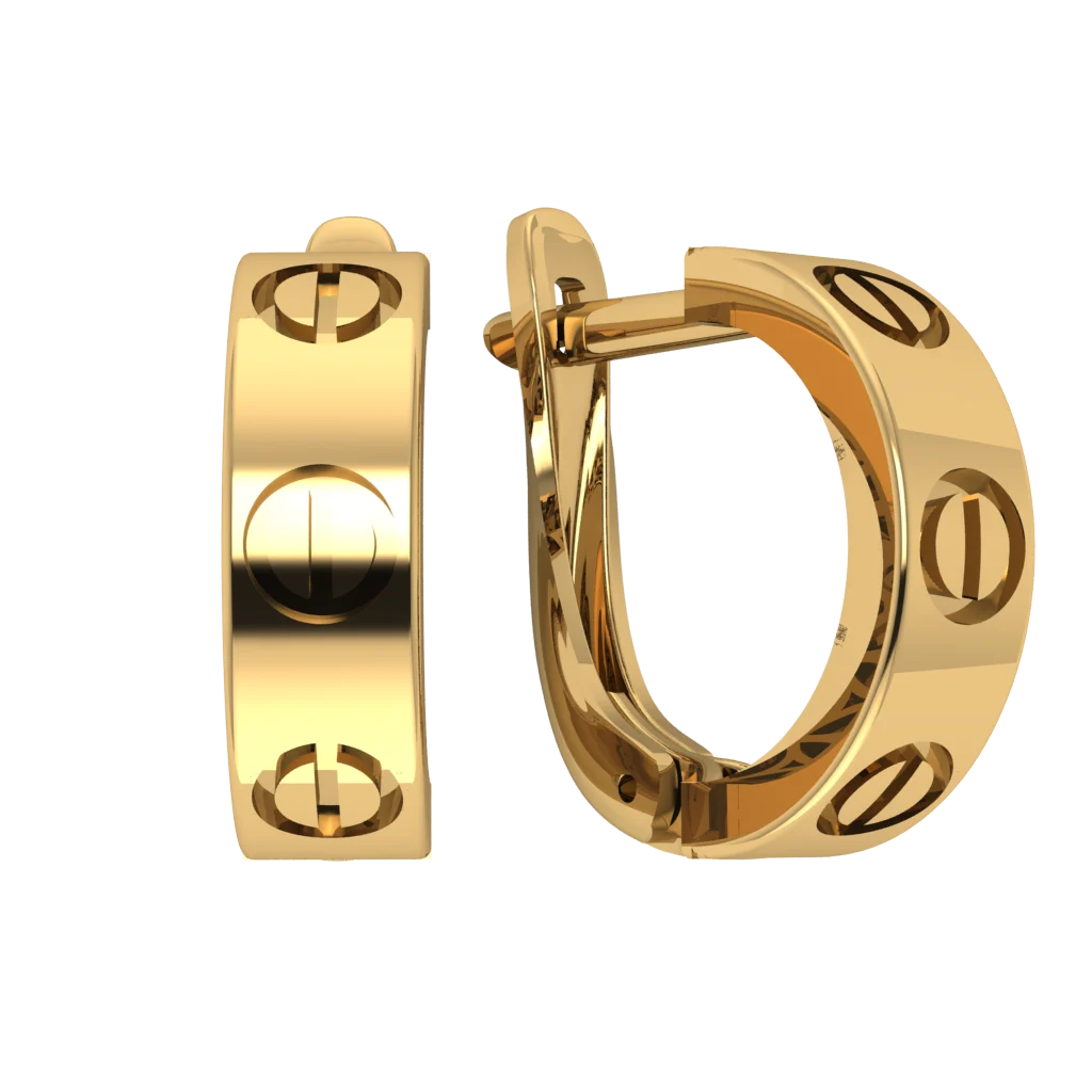 Серьги с круглым корпусом и гравировкой винтов по окружности. Стильный «механический» мотив на золотом фоне.