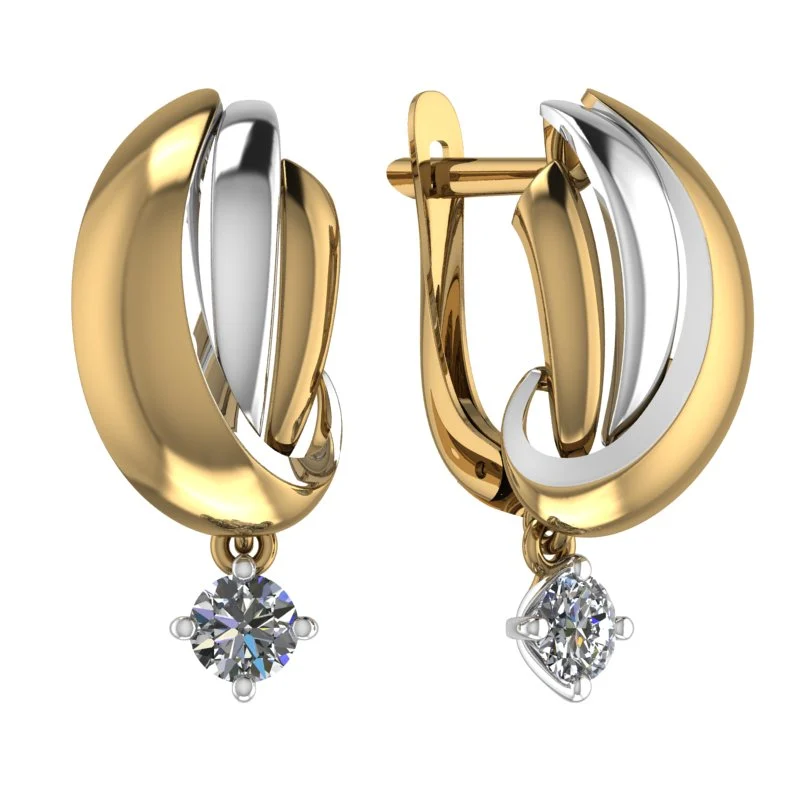 Серьги с двухцветными лепестками и подвесом с прозрачным камнем. Мягкие дуги, контраст металлов и яркая искра при движении.