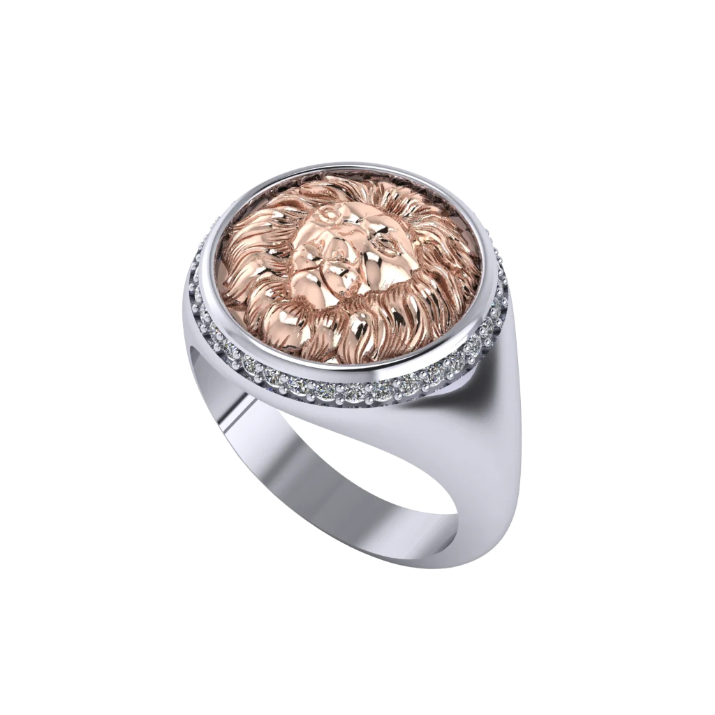 Кольцо-печатка из белого и красного золота с круглым медальоном в виде головы льва и сияющей дорожкой прозрачных камней по краю. Модель выглядит солидно и выразительно.