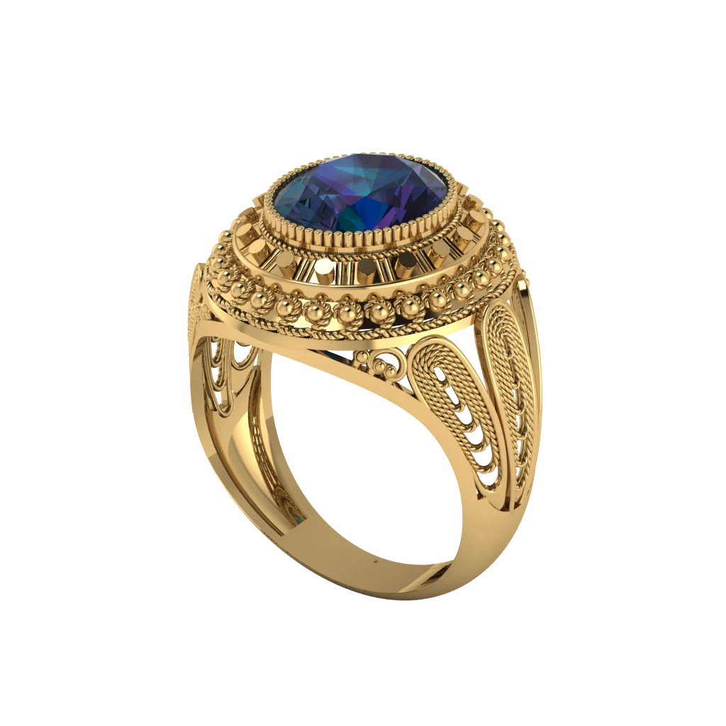 Эффектная печатка из золота с крупной овальной синей вставкой и ажурной оправой. Высокая посадка камня и декоративные элементы создают впечатление винтажной роскоши.