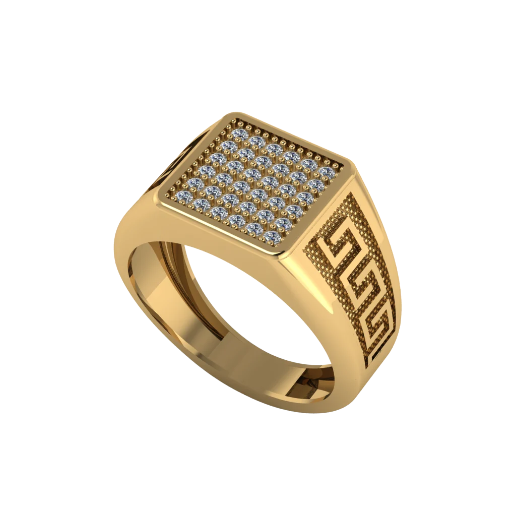 Золотая печатка с квадратной площадкой, полностью покрытой прозрачными камнями, и геометрическим орнаментом на боковине. Модель сочетает насыщенный блеск и строгий мужской силуэт.