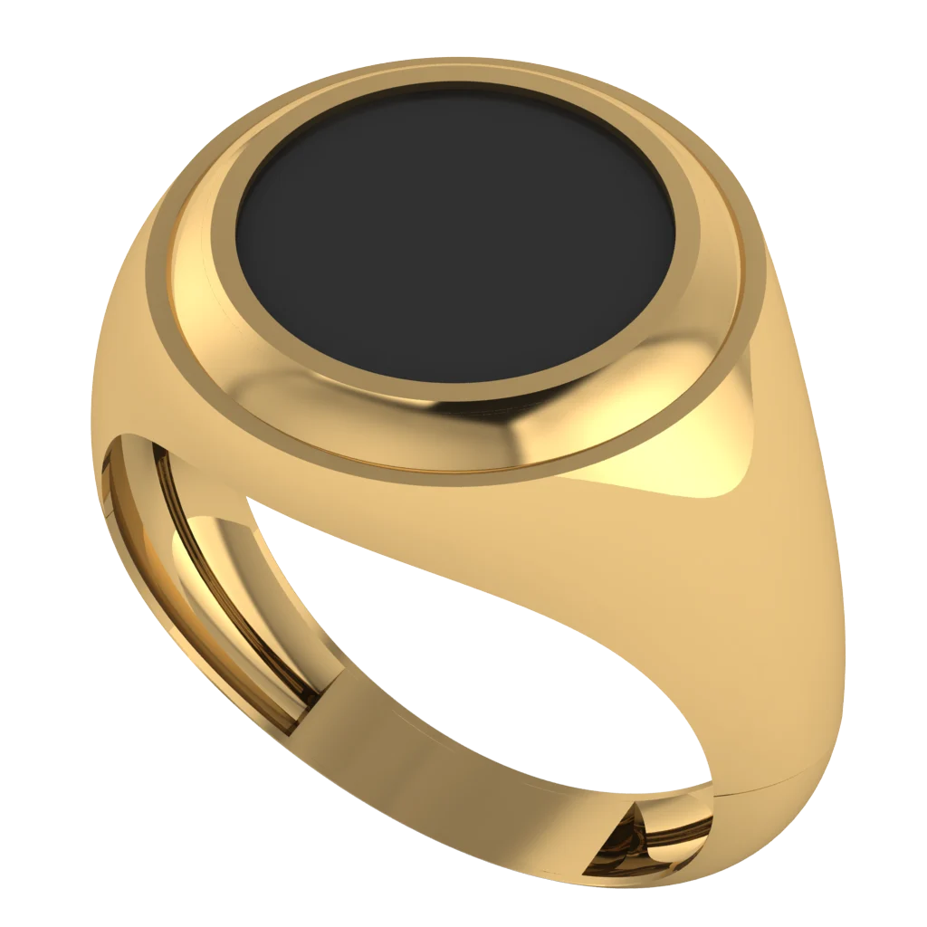 Лаконичная мужская печатка из жёлтого золота с гладкой круглой чёрной вставкой. Обтекаемая форма без лишнего декора делает украшение универсальным и по-настоящему благородным.
