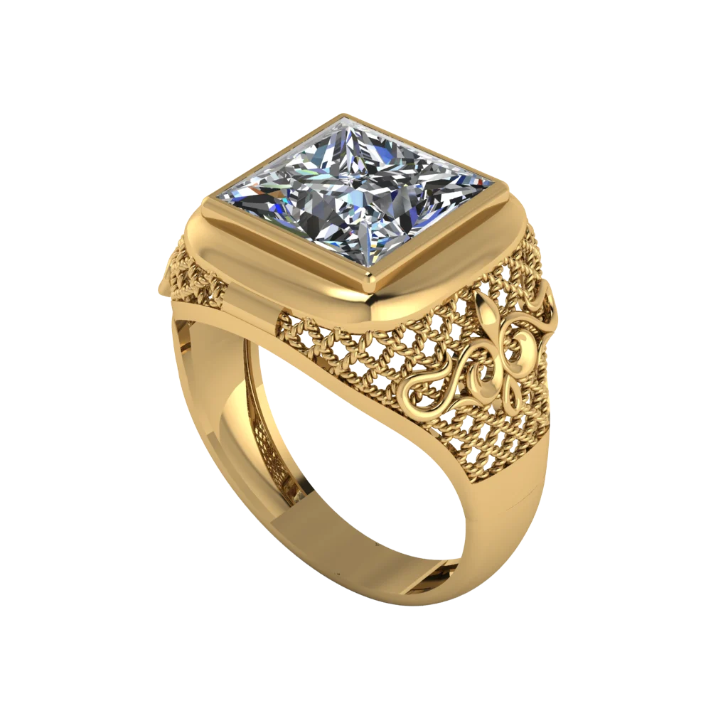Печатка из жёлтого золота с большим прозрачным камнем квадратной формы и филигранным узором на боковинах. Мягкие линии корпуса делают массивную модель визуально сбалансированной.