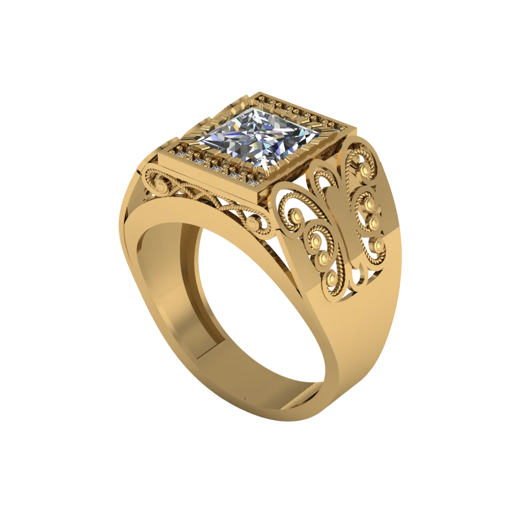 Мужская печатка из золота с квадратным прозрачным камнем, декоративными завитками по бокам и аккуратными рядами вставок у площадки. Яркая модель с выразительным блеском.