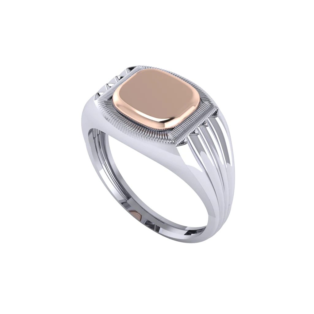 Мужская печатка из белого и красного золота с гладкой овальной площадкой без камней. Контраст металлов и вертикальные линии по бокам делают дизайн строгим, современным и уверенным.