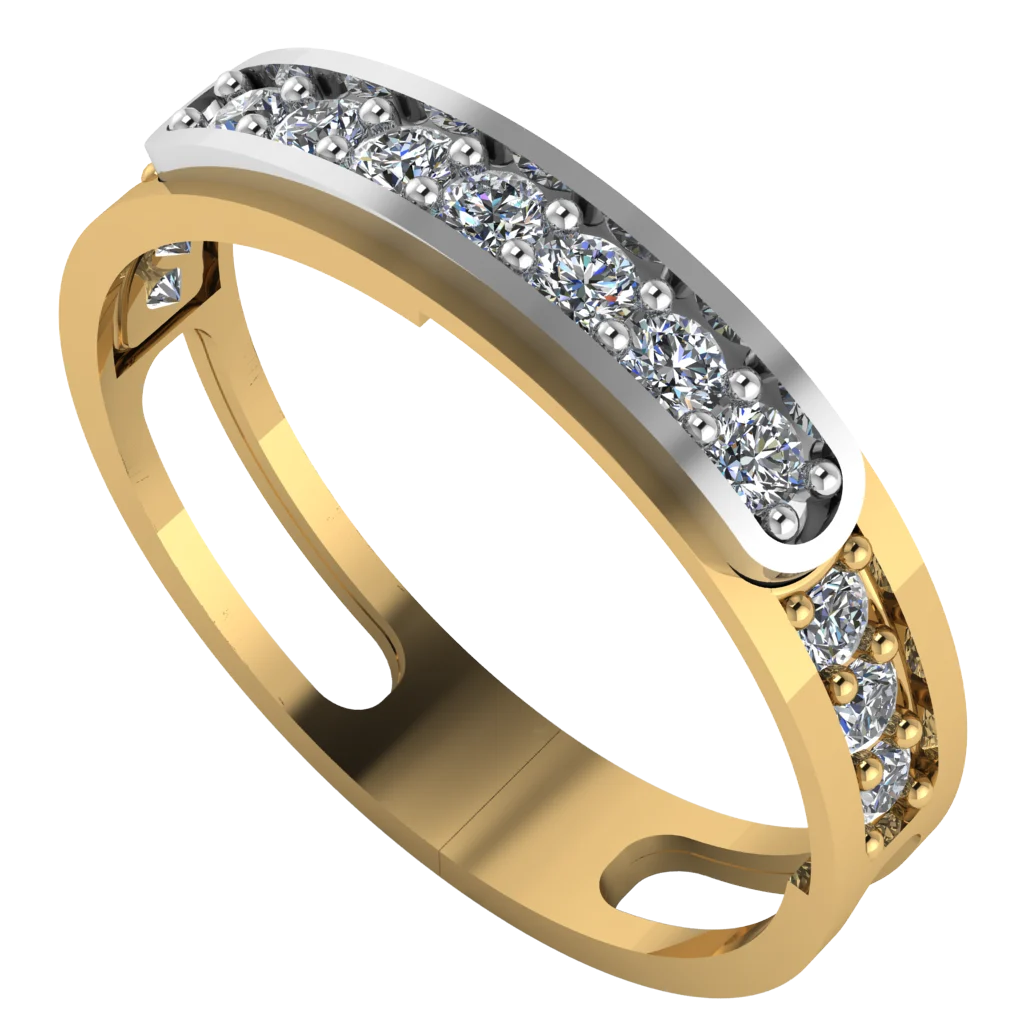 Кольцо из жёлтого и белого золота с вытянутой верхней частью и рядом светлых камней. Контраст двух оттенков металла делает модель аккуратной, свежей и уместной на каждый день.