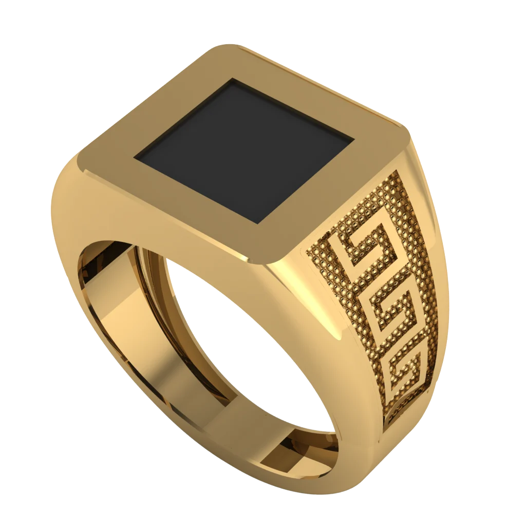 Массивная печатка из золота с квадратной чёрной площадкой и графичным узором по бокам. Чистая геометрия без камней делает модель сдержанной, но визуально очень сильной.