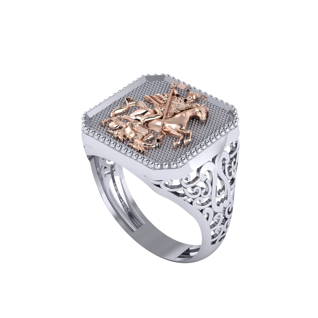 Печатка из белого и красного золота с круглой светлой верхней частью и объёмным орнаментом по бокам. Контраст металлов делает модель выразительной, но не перегруженной.