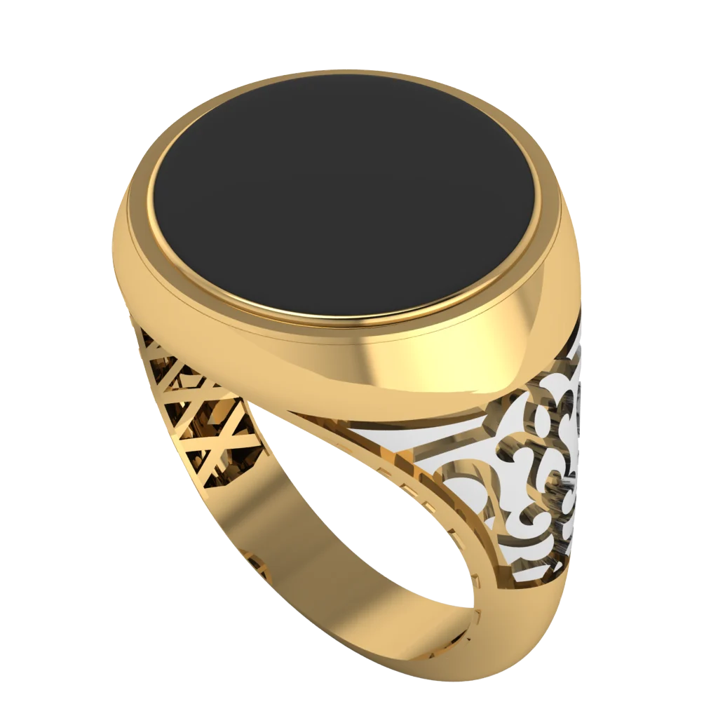 Овальная печатка с гладкой чёрной площадкой и ажурными боковинами светлого тона. В золоте такая форма смотрится спокойно, но достаточно выразительно.