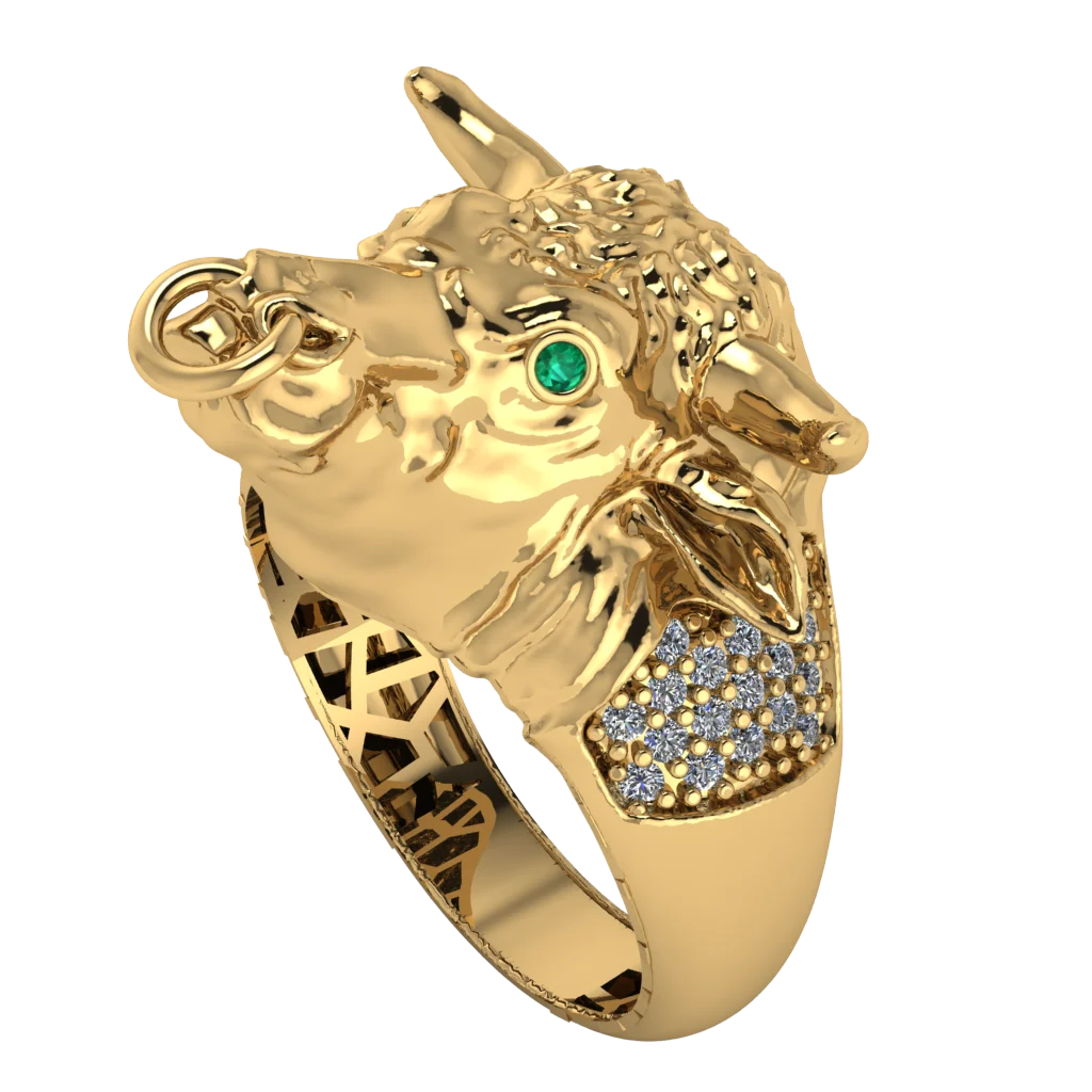 Мужская модель с головой дракона, зелёными глазами и россыпью светлых камней на боковой части. Золотая поверхность подчёркивает сложный объёмный рельеф.