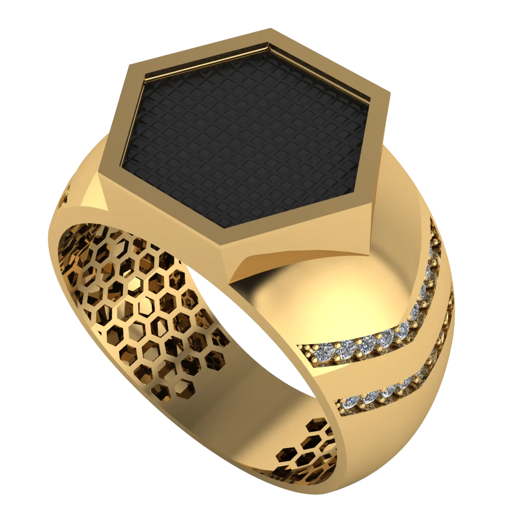 Широкая печатка с шестиугольной чёрной вставкой, боковой перфорацией и дорожкой светлых камней. В золоте модель выглядит необычно и очень современно.